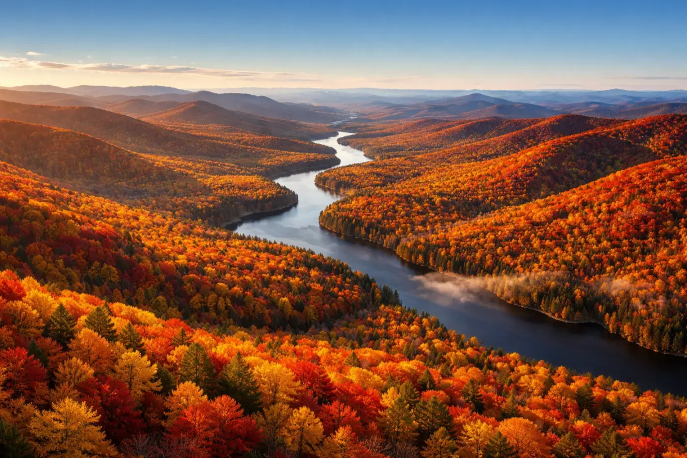 The drive along Route 108 through Smugglers Notch is worth making on its own, especially when the hillsides are saturated with color. Visitors can ride the gondola up Mount Mansfield for panoramic views above the tree line, walk the Stowe Recreation Path through the valley, and stop at Cold Hollow Cider Mill for fresh-pressed cider and warm apple donuts.